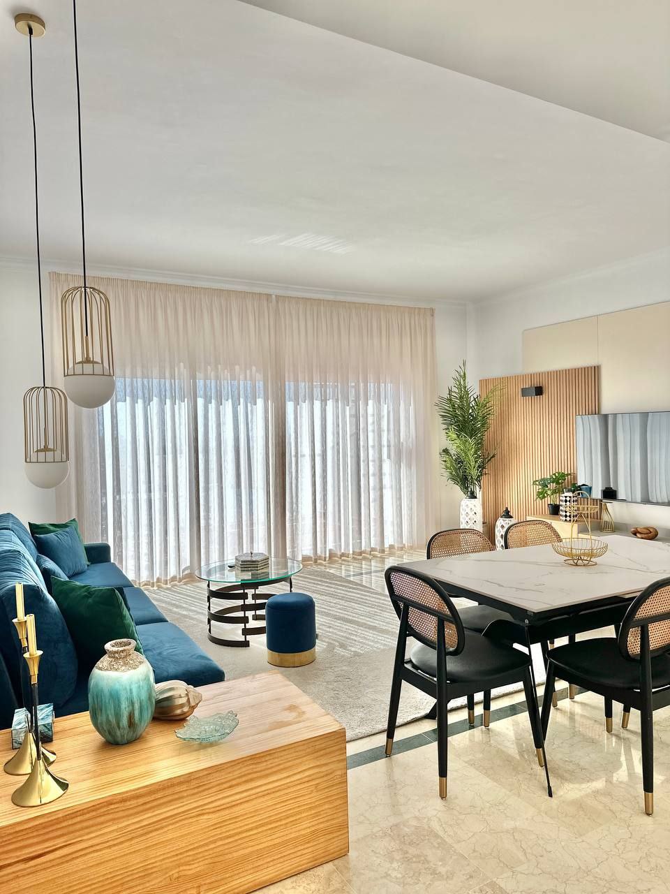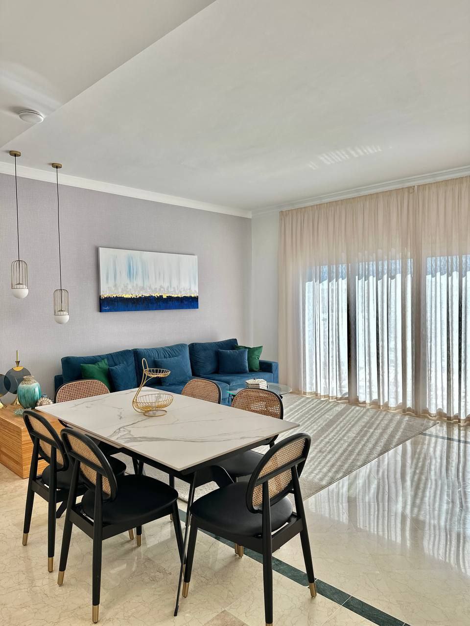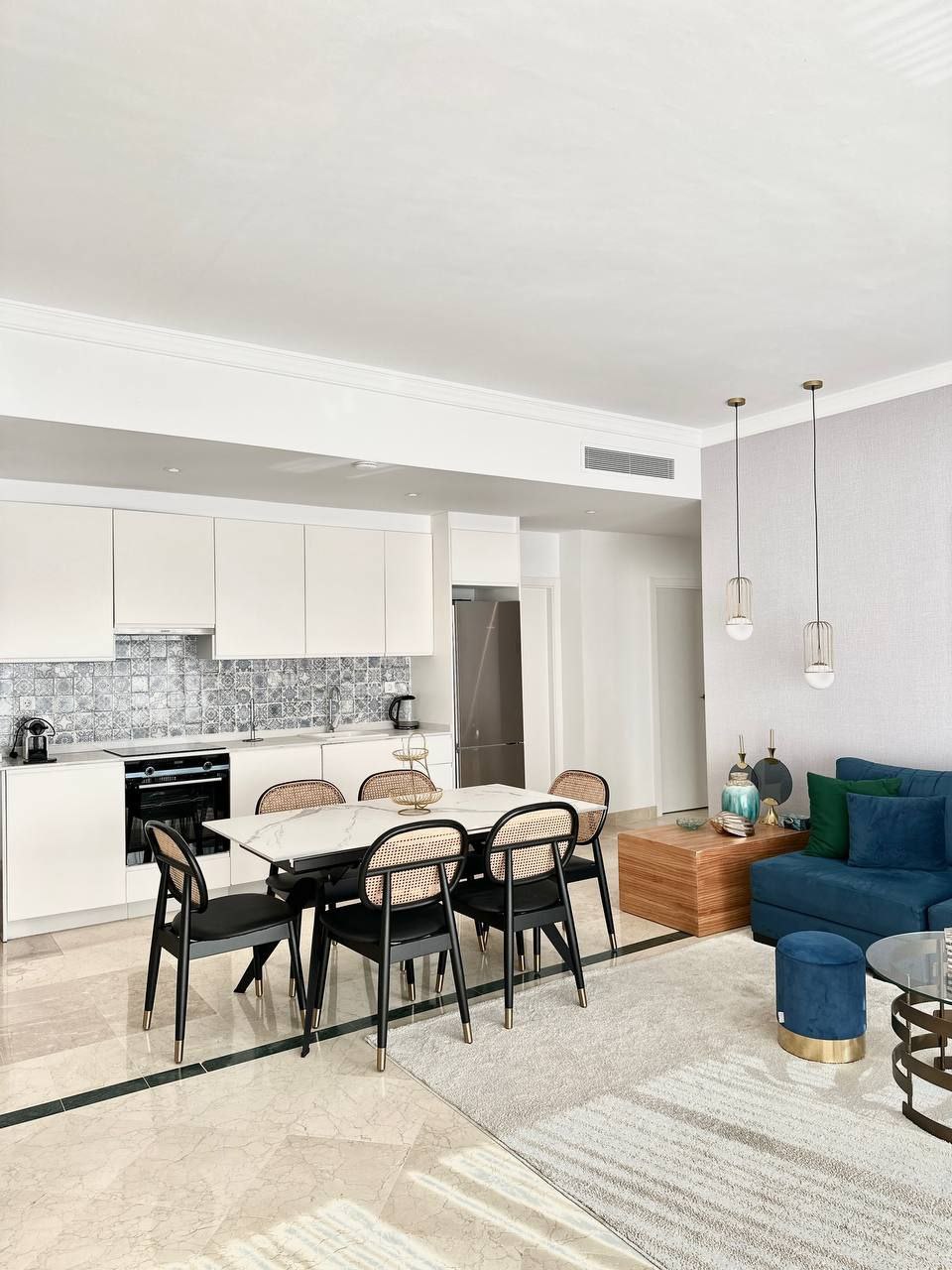 A three-bedroom apartment is available for rent in the gated community of Pueblo Paraiso. Three bedrooms Two bathrooms Large living room opens onto the kitchen Furnished solarium terrace with barbecue area, as well as a furnished balcony. The apartment has a stunning view. Total area: 101 m² The apartment includes all appliances, dishes, bed linens, air conditioning, and Wi-Fi Parking meter and storage space The community itself offers swimming pools, a gym, a restaurant, a playground, and coworking space.